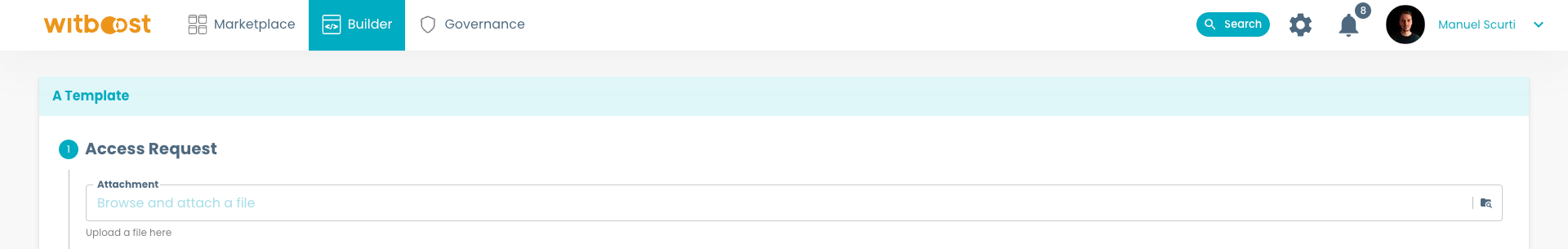 With a FilePicker you can ask users to attach a file within a template. The file won't be stored in witboost, but it can be passed to the actions configured in a template leveraging nunjucks.